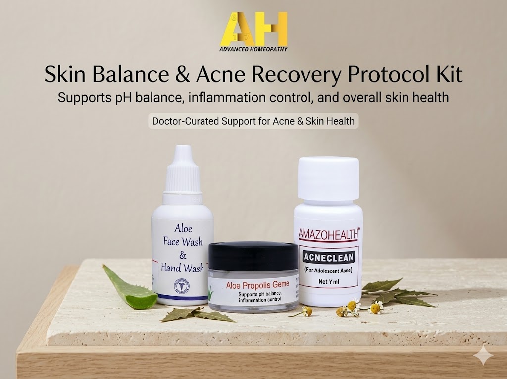 Skin Balance and Acne recovery protocol kit supports pH balance, inflammation control, and overall skin health. Its a high-quality advanced homeopathic formula with skincare facewash and a natural organic Aloe based antiseptic for Adolescent acne, comedones, papules, pustules, nodules, and/or cysts, and for post-acne scars for long-term results.